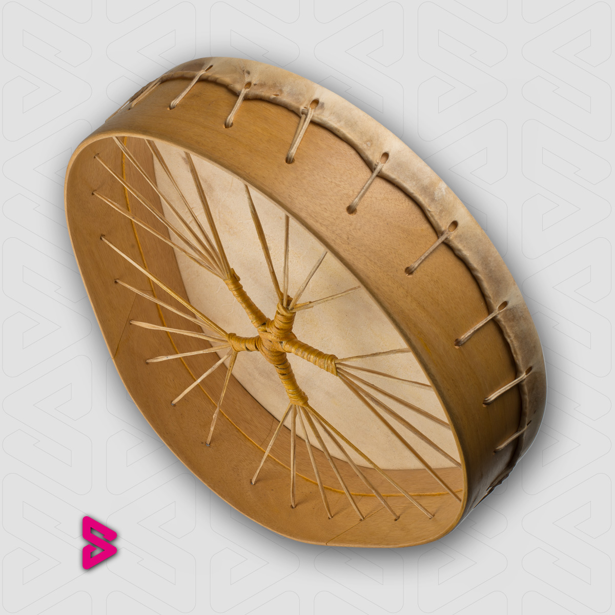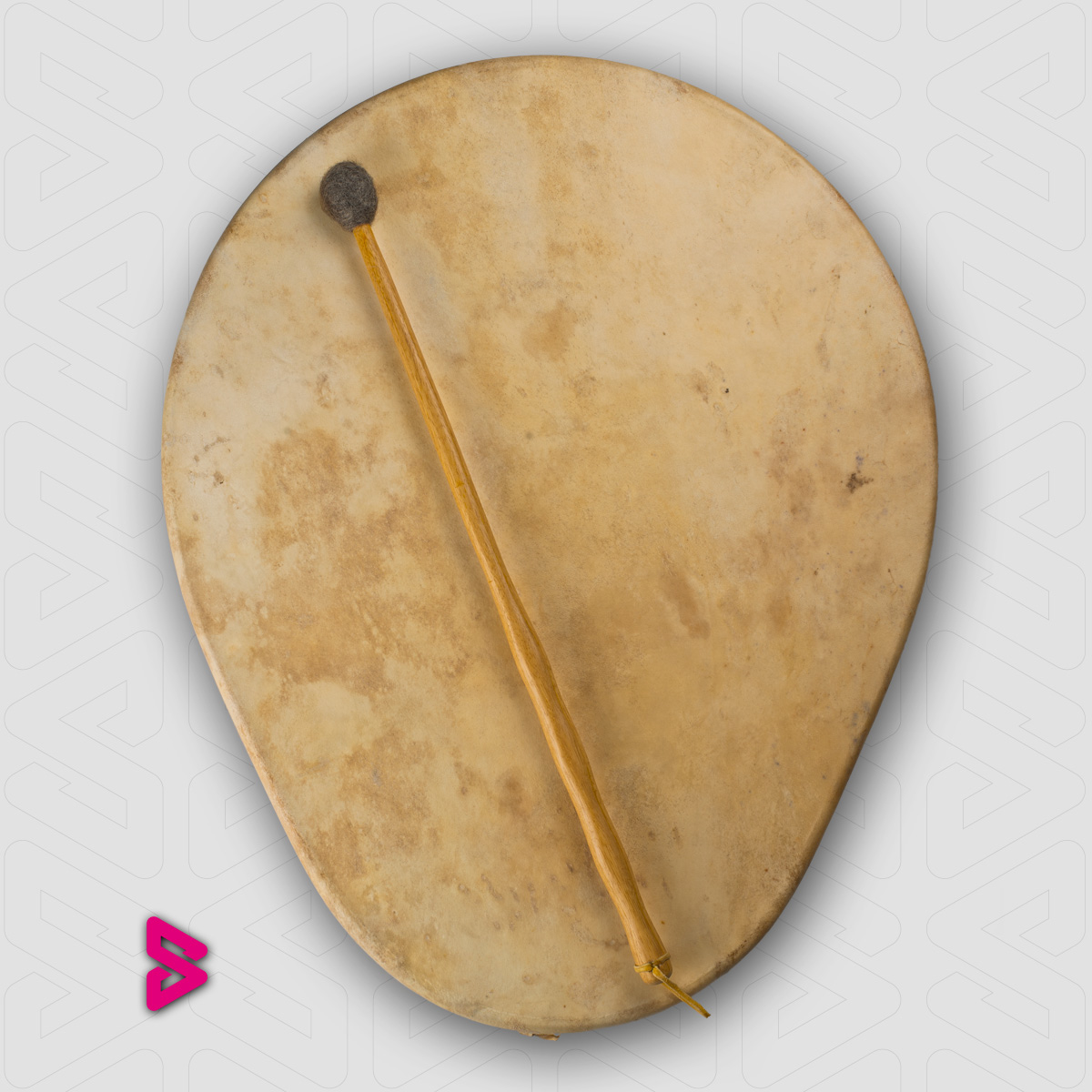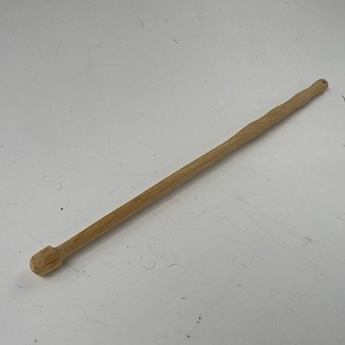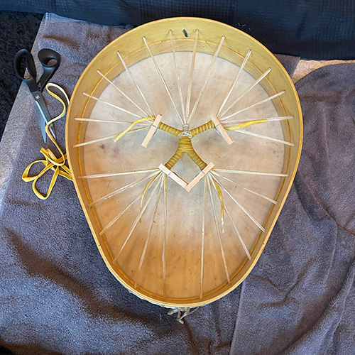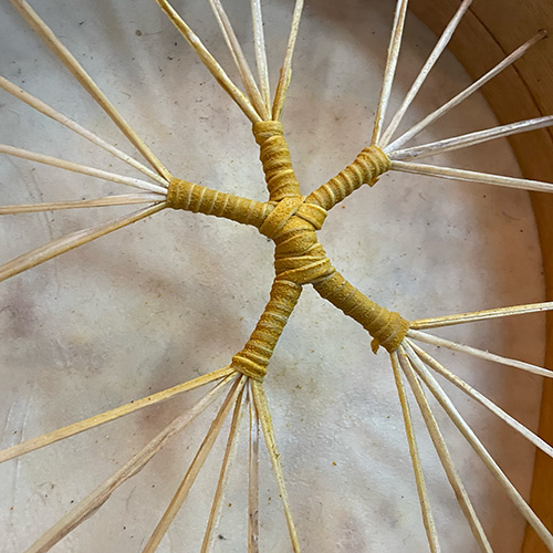 Het handvat is omwikkeld met rendierhuid dat zijn gele kleur gekregen heeft door het te weken in zaagsel van het citroenhout van de hoepel. De mens die in het handvat is te vinden neemt de verbindende plek in. Hij heeft de touwtjes in handen en bespeelt, of is hij de marionette ...